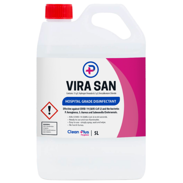 DESCRIPTION: Hospital Grade Disinfectant. VIRA SAN has been proven to kill COVID-19 (SARS-CoV-2) in 60 seconds. Australian Register of Therapeutic Goods for COVID-19 claim (ARTG No. 340431). The synergy between Hydrogen Peroxide and Benzalkonium Chloride is an effective way to mitigate the threat of COVID-19, germs and bacteria (S. aureus, Pseudomonas aeruginosa, Salmonella choleraesuis). Vira San is safe to use on almost all hard surfaces including but not limited to; glass, plastic and stainless steel. Easy to use, simply spray, wait and wipe. Effective sanitisation within 1 minute. Formulated and developed in line with guidelines published by the World Health Organisation (2020).